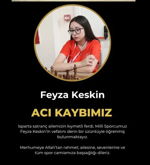 Feyza Keskin’in satrançta A kategorisine kadar yükseldiği ve milli satranç sporcu olduğu öğrenildi. Üzücü haberin ardından Isparta Satranç İl Temsilciliği tazeyi mesajı yayınladı. Mesajda şu ifadelere yer verildi; “Isparta satranç ailemizin kıymetli ferdi, Milli Sporcumuz Feyza Keskin’in vefatını derin bir üzüntüyle öğrenmiş bulunmaktayız. Merhumeye Allah’tan rahmet; ailesine, sevenlerine ve tüm spor camiamıza başsağlığı dileriz.”