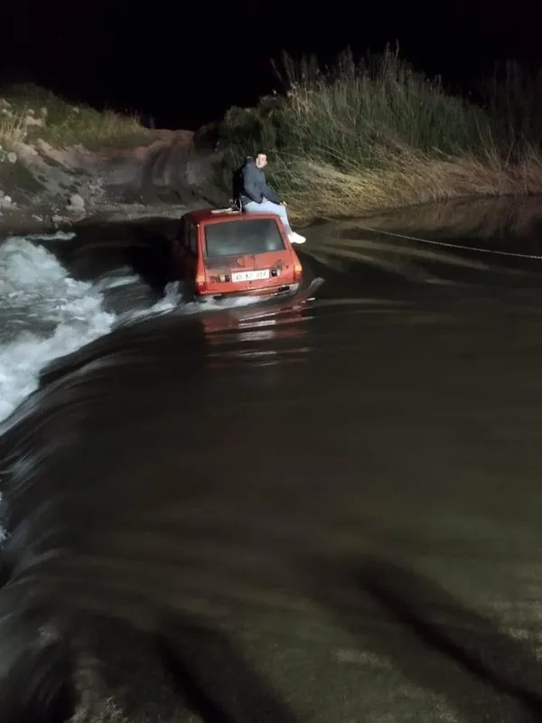 Manisa’nın Saruhanlı ilçesi, Develi mahallesi yakınlarında meydana gelen olayda, dere yatağından geçmeye çalışan ve içinde iki kişinin bulunduğu araç dere ortasında kaldı. Aracın üzerine çıkan vatandaşlar, yardım çağrısında bulundu.